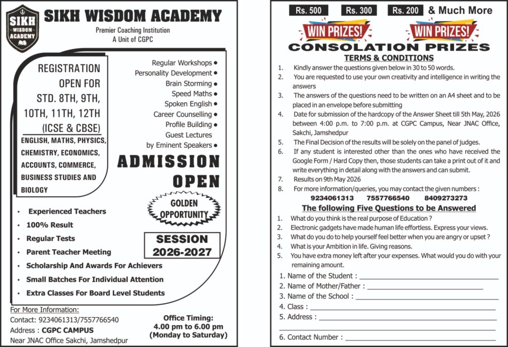 जमशेदपुर- सेन्ट्रल गुरुद्वारा प्रबंधक कमेटी के अधीन चलने वाले शिक्षण संस्थान सिख विजडम एकैडमी द्वारा खालसा सृजना दिवस एवं बैसाखी पर्व के शुभ अवसर पर एक प्रतियोगिता का आयोजन किया जा रहा है। जिसमें कई तरह के पुरस्कारों की बहार लगी हुई है l