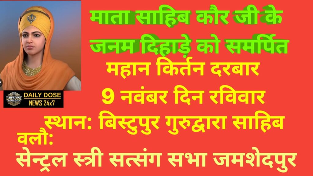 जमशेदपुर- सेन्ट्रल स्त्री सत्संग सभा द्वारा खालसा पंथ की माता साहिब कौर जी का 344 वां जनम दिहाड़ा आगामी 9 नवंबर को शहर के बिस्टुपुर गुरुद्वारा साहिब में बड़ी श्रद्धा और उत्साह से मनाया जाएगा।