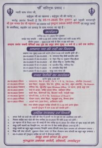 जिसमें हजूरी रागी एवं ग्रंथी भाई रामप्रीत सिंह जी गुरबाणी किर्तन द्वारा संगत को निहाल करेंगे। कार्यक्रम का समापन 12 बजे होगा। अरदास के उपरांत संगत में मिस्सी रोटी, लस्सी एवं अचार का अटूट लंगर वितरित किया जाएगा।